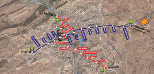 دراســة جــدوى ترامــواي الجلفة التي أُسنـــدت إلى مكتـب للــدراســات جــزائري – فرنسـي EGISRAIL  -   DARTOTAL SOLUTION سمحت بإمكانية إدراج خطين أوليين و مختلفين للترامواي