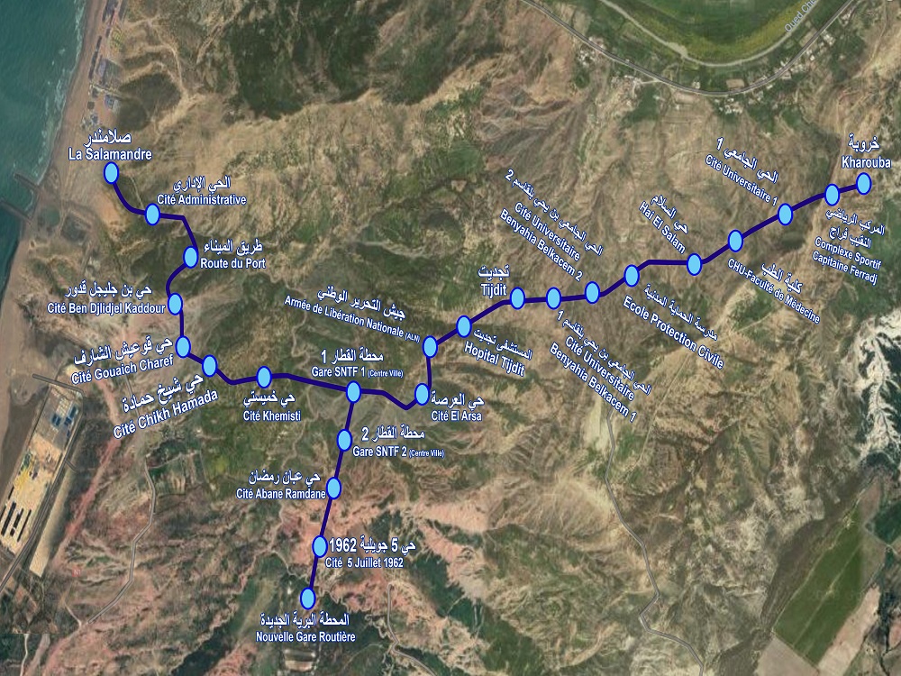 Centre de maintenance auxiliaire : 1 hectare, Le Les études étant achevées, les travaux de réalisation de la 1ère ligne du Tramway de Mostaganem d'un linéaire de 14,2 Km, composée de 24 stations qui s'étend de Kharouba vers, d'une part de la Nouvelle Gare Routière et d'autre part vers le Lycée Oukraf, dont le marché a été attribué au groupement Franco-Espagnol CORSAN ISOLUX et ALSTOM, sont en cours de réalisation.